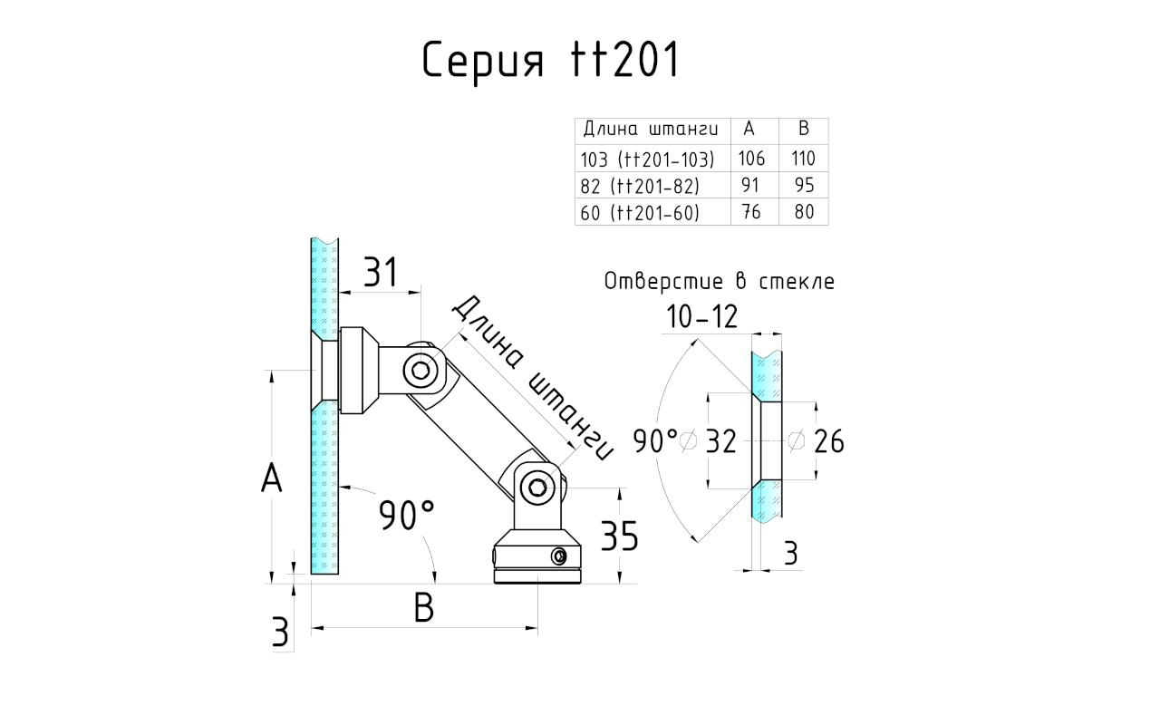 Крепление стекло-стена, штанга 103 мм, под зенковку tt201-103 SSS