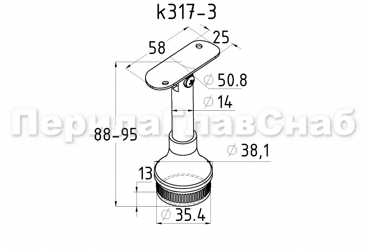 Предназначен для стойки Ø38.1 мм (AISI 201 - k815, AISI 304 - k854) под поручень Ø50.8 мм (AISI 201 - k817, AISI 304 - k855). Ложемент у данной модели регулируемый с двумя отверстиями под саморезы (М-3307, М-4074) для поручня.