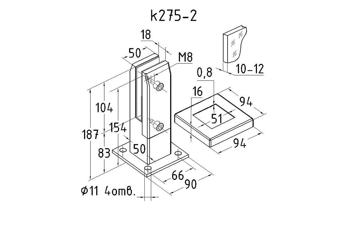 Стеклодержатель литой напольный, плоский 50х50х190 мм, для стекла 10-12 мм, полированный. Марка стали - AISI 304. Вам понадобиться для крепежа потайной винт под шестигранник k601-19-120. Необходимо отверстие в стекле- 16 мм.
