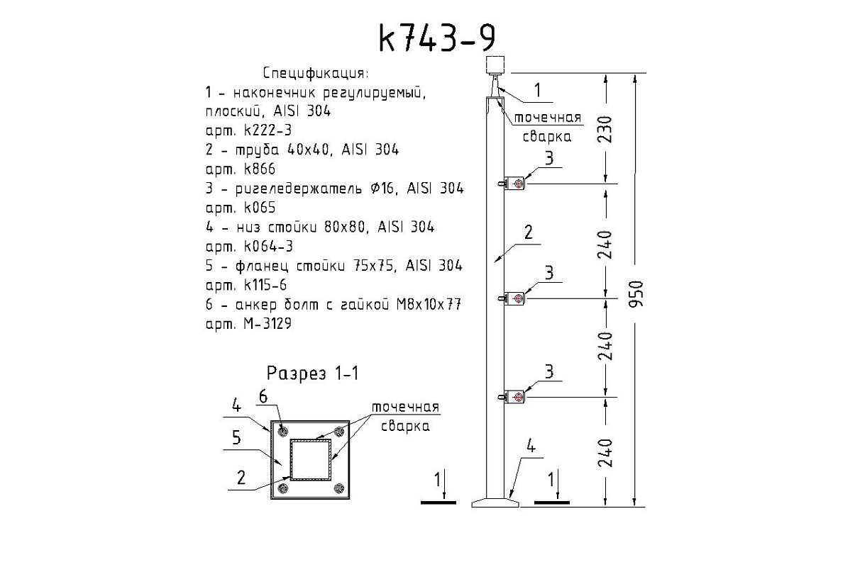 Стойка квадратная 40х40: полированная базовая, с плоским наконечником, высота 950 мм k743-9