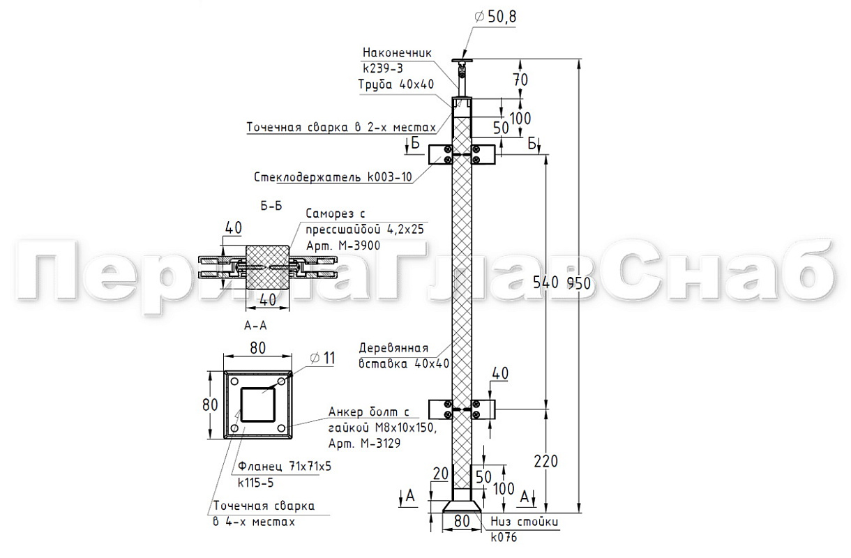 Стойка квадратная 40х40: 4 литых стеклодержателя, шлифованная, высота 950 мм AISI 304 k746-7 купить в Екатеринбурге