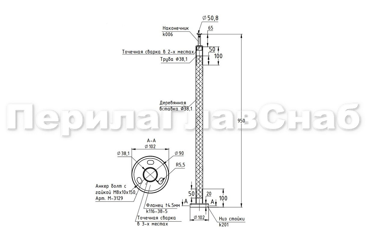 Готовая стойка Ø38,1 мм, с фланцем и наконечником, высота 950 мм, полированная (AISI 304) k702 купить в Екатеринбурге
