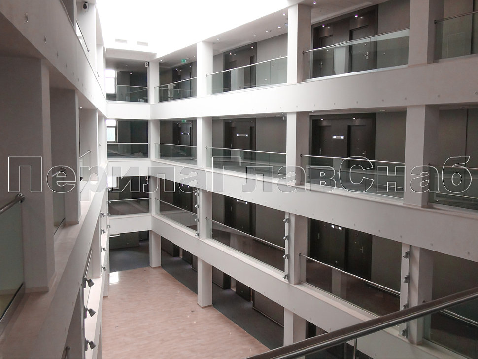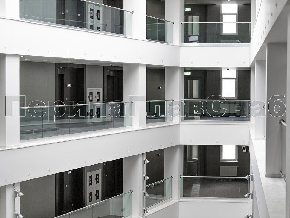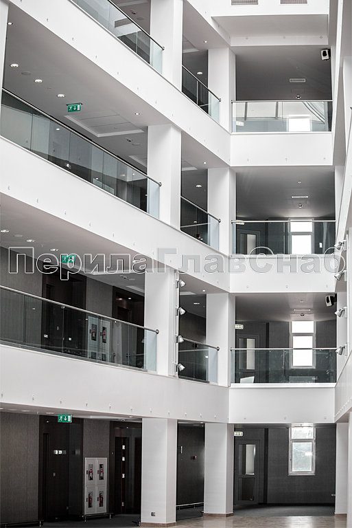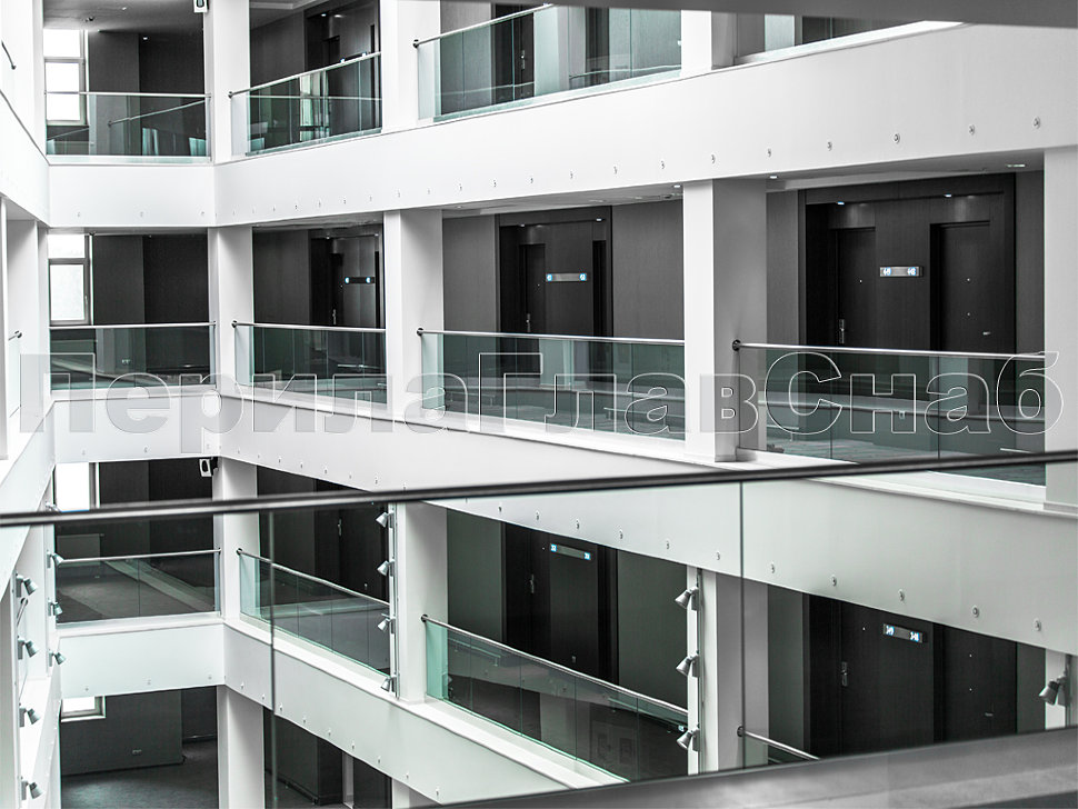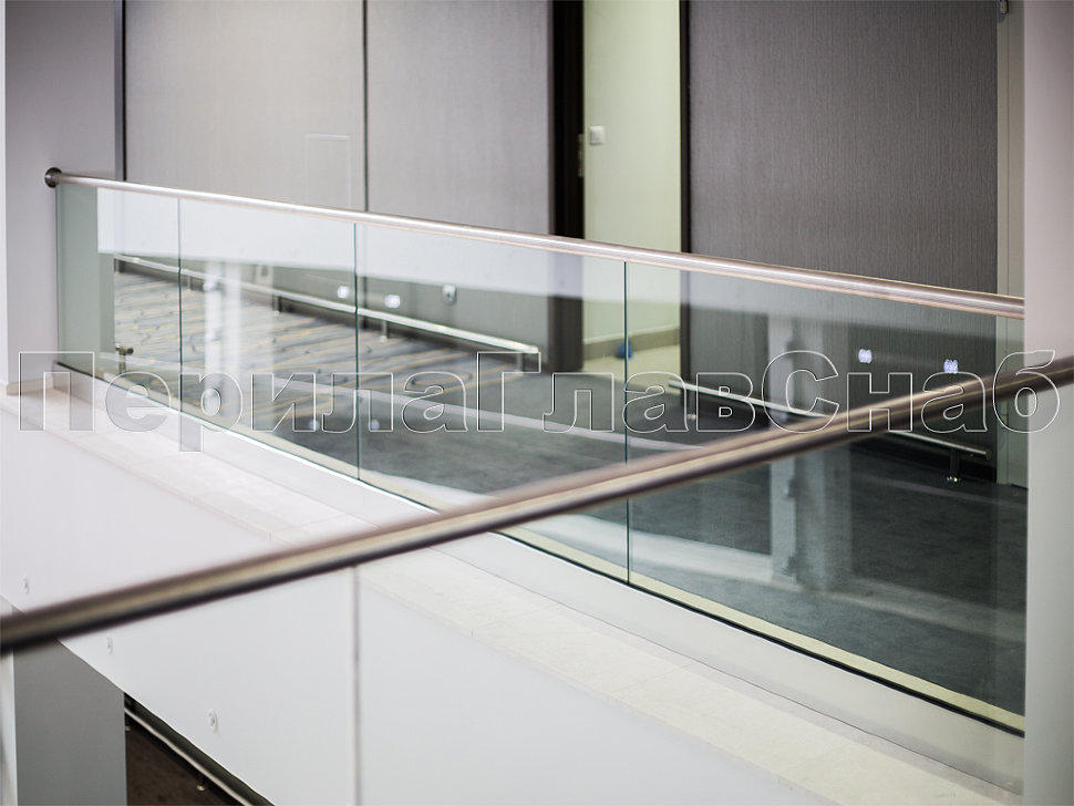Также стоит отметить ограждения с декоративными металлическими листами, которые крепятся на стандартных стеклодержателях. Несмотря на простоту самой конструкции, она потребовала дополнительных работ по обработке листа внутри ограждения и очистки краев от металлических заусенцев. Эта задумка дизайнеров помещения превосходно была реализована нашими опытными монтажными бригадами, опыт каждой из которых составляет не менее 10 лет.