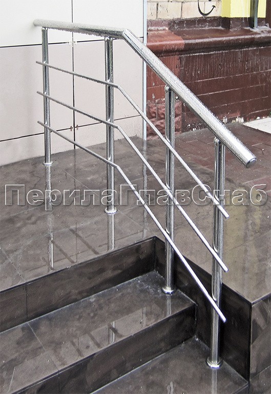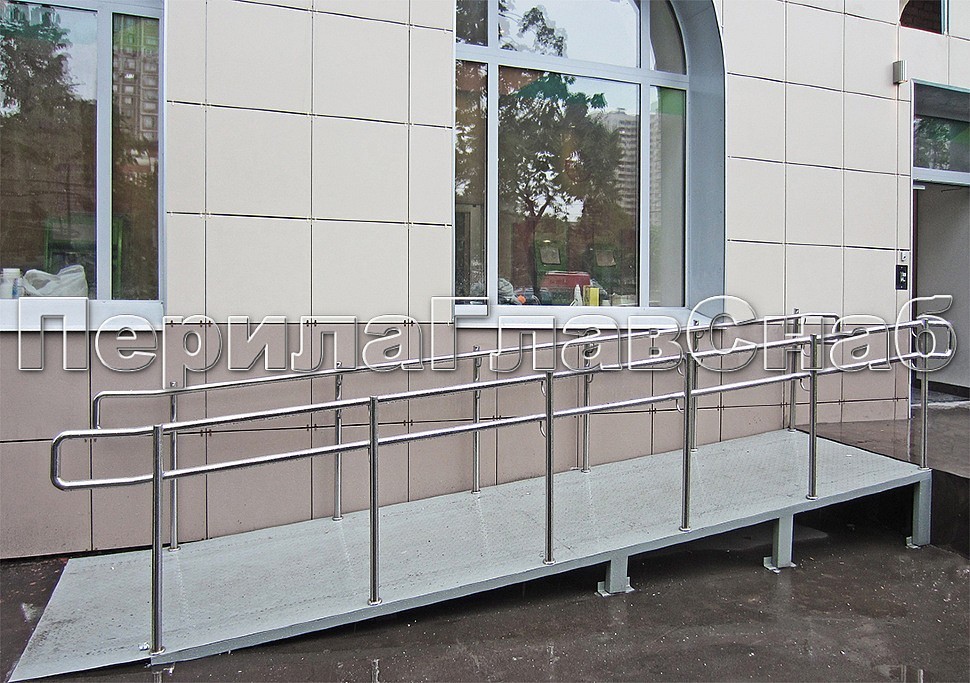 Ограждение на металлической платформе. Двойной поручень 50-й трубы сделан специально для удобства пользования людей с ограниченным возможностями в передвижении.