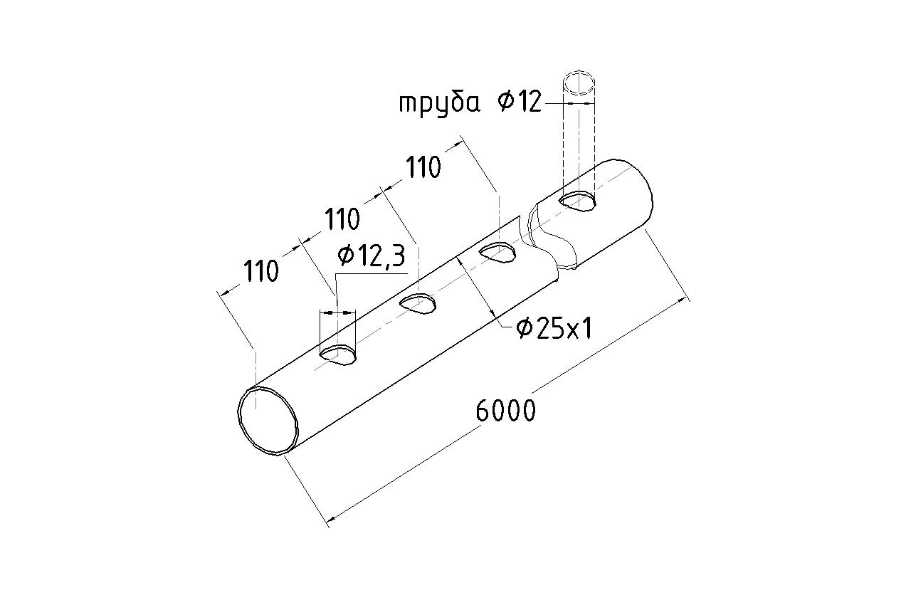 В конструкции предусмотрены овальные отверстия. Марка стали: AISI 304 — устойчива к коррозии, подходит для эксплуатации в условиях повышенной влажности. Размеры: 25 мм (наружный диаметр) × 1 мм (толщина стенки) × 6000 мм (длина). Перфорация: отверстия Ø12 мм с шагом под углом 30°. Обработка поверхности: GRIT 600 — полированная.