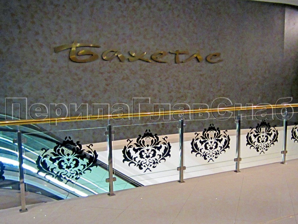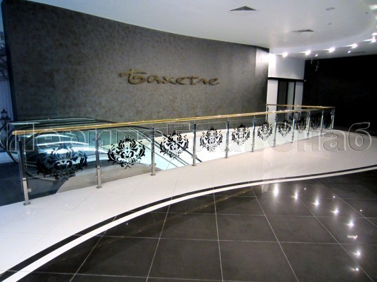 Ограждение лестницы со стеклом, тонированным в массе, стойки и завязки поручня из латуни