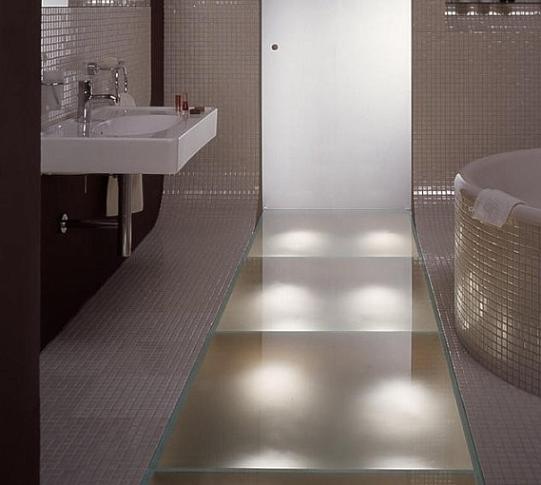 Полы из стекла для ванной комнаты сочетают в себе декоративную выразительность, надежность и удобство в уходе, легко адаптируясь к напольным покрытиям любого стиля.